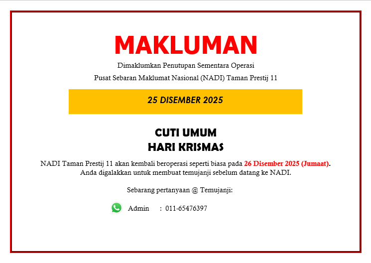 Tarikh : 15/01/2026 Masa : 3.30 Petang – 4.30 Petang Lokasi :NADI Taman Prestij 11 Peserta : 1 Orang Tujuan ProgramProgram ini bertujuan membantu pelajar meningkatkan kefahaman dalam subjek Sains, membina keyakinan dalam komunikasi serta mengukuhkan kemahiran membaca, menulis dan […]
