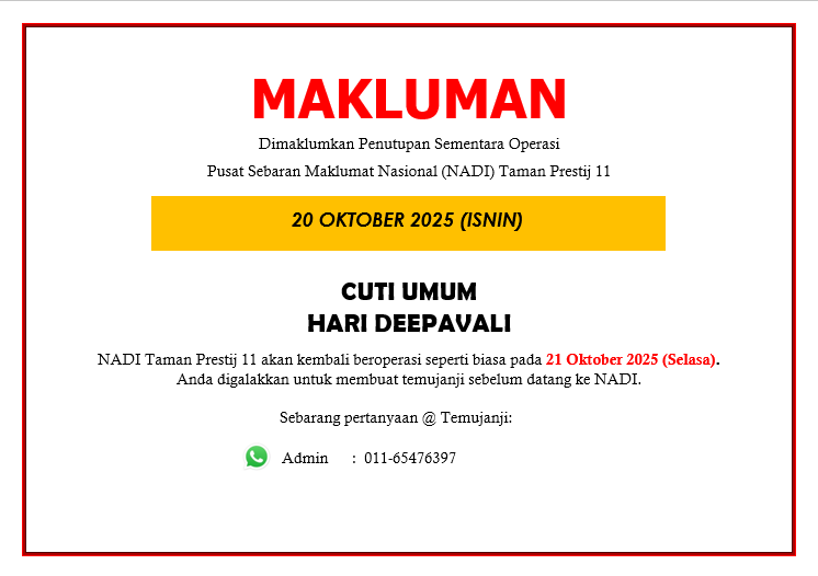 Tarikh : 18 / 10 /2025 Masa : 10.00 Pagi– 11.00 Pagi Lokasi : NADI Taman Prestij 11 Peserta : 2 Orang Tujuan ProgramProgram ini dilaksanakan bagi meningkatkan kesedaran peserta tentang bahaya dan cabaran teknologi Deepfake serta penggunaan Kecerdasan Buatan […]